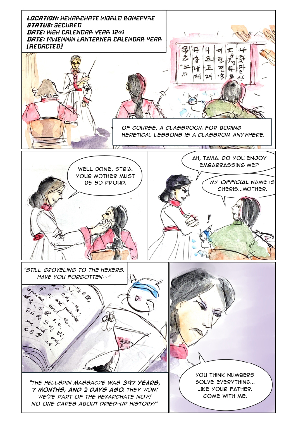 Cheris (off-panel): The Hellspin Massacre was 397 years, 7 months, and 2 days ago. They won! We’re part of the Hexarchate now! No one cares about dried-up history!